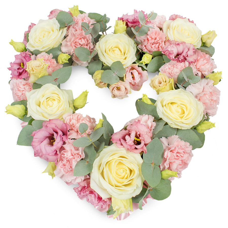 Pay your respects with our refined open heart floral tribute. This elegant bouquet features a beautiful mix of white roses, pink carnations, and pink lisianthus, accented with fresh eucalyptus leaves for a touch of grace.